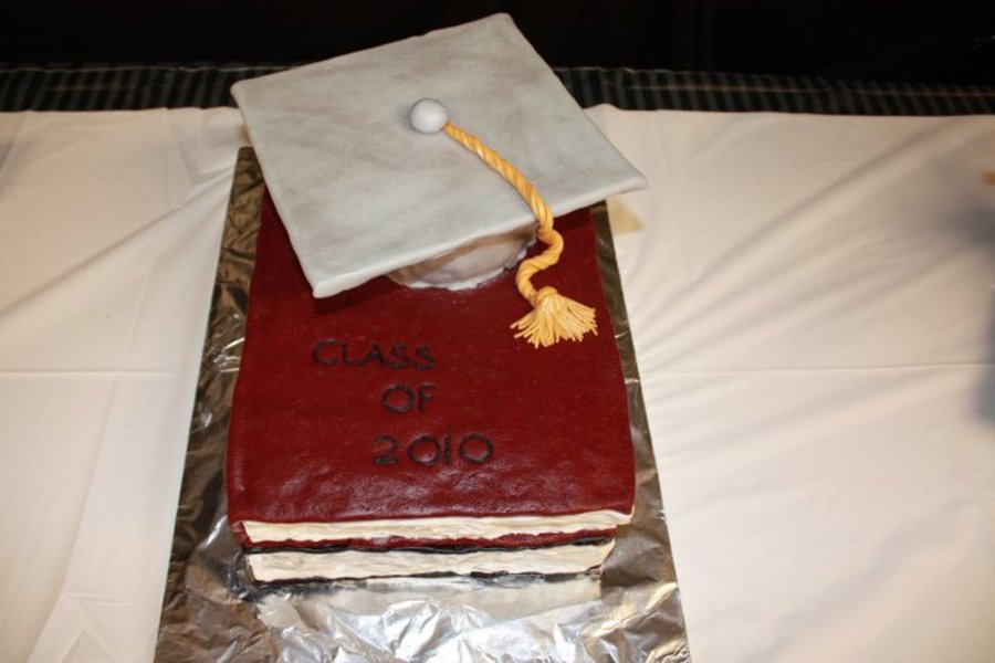 Stack of books with a graduation cap and tassel all made out of fondant.