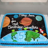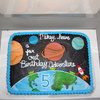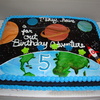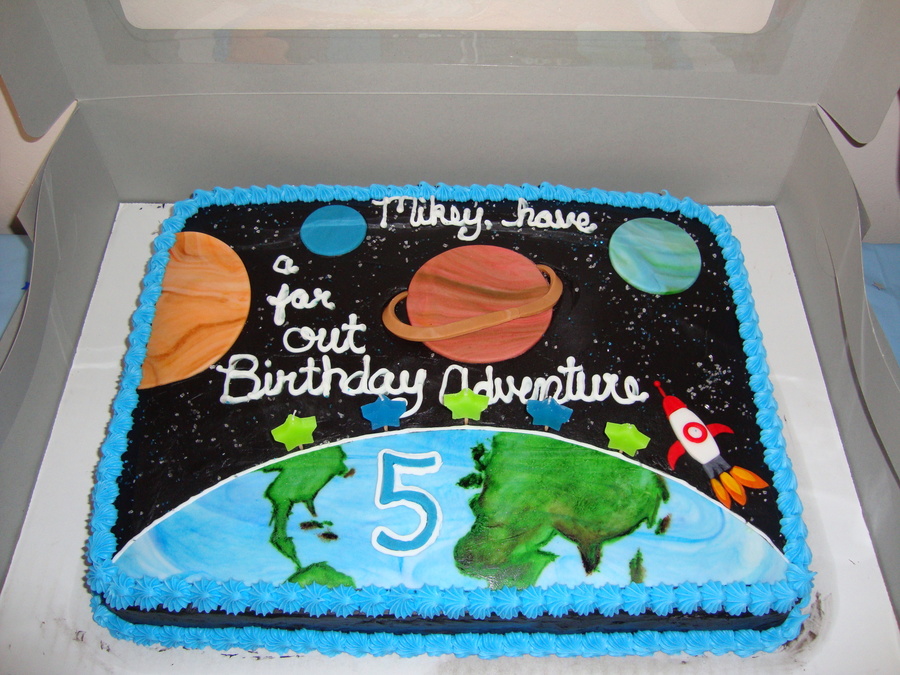 Outer Space Cake: choc. w/ whipped icing and fondant planets and rocket.