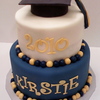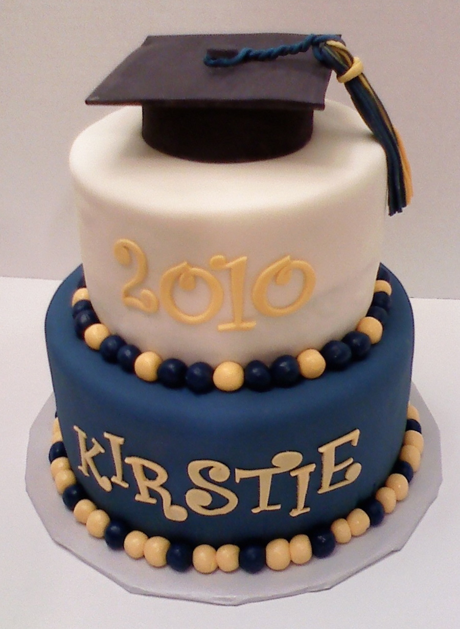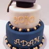 Two tiered graduation cake,. My daughter and step-son are both graduating high school this year, so I put their names on opposite sides. =) Fondant covered cake with gum paste mortar board.