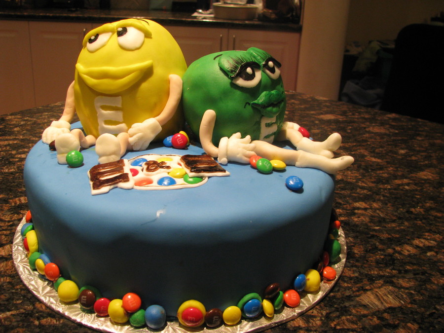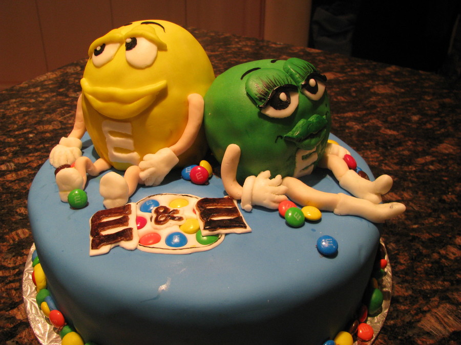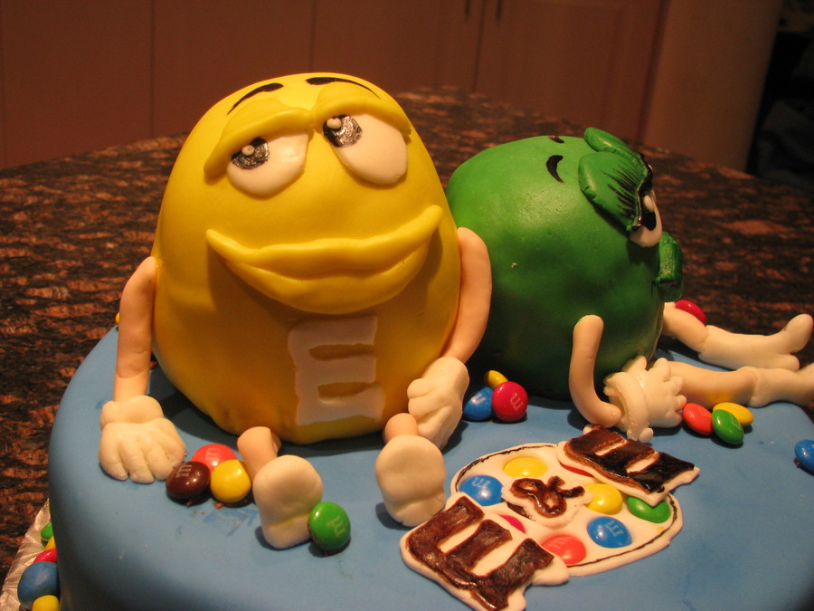 MMF was used for most of the cakes details. The arms are 50/50 fondant and GP. Characters were carved out of pound cake, iced and then fondant covered. This was for a friend's son turning 30 whose name begins with "E". Since he was little his mom always told him they weren't m&m's but that they were E&E's.