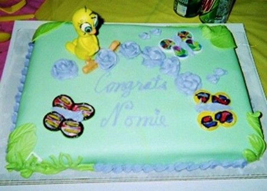 I made this cake for my dtr's baby shower. It was carrot cake from the box with eggnog instead of water added, filled with homemade pineapple filling. Cake is covered with creamcheese buttercream then green fondant. Tweety and leaves and "butterflies" (which my 3 y/o g.s. helped paint) are made of mmf fondant. The purple roses (my daughter's fav color) are of royal icing as are the butterflies bodies. She loved the cake and it was good tasting too!