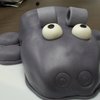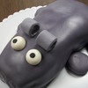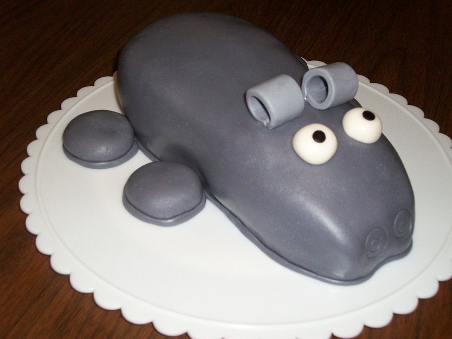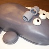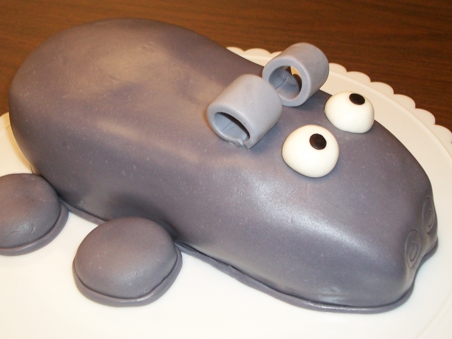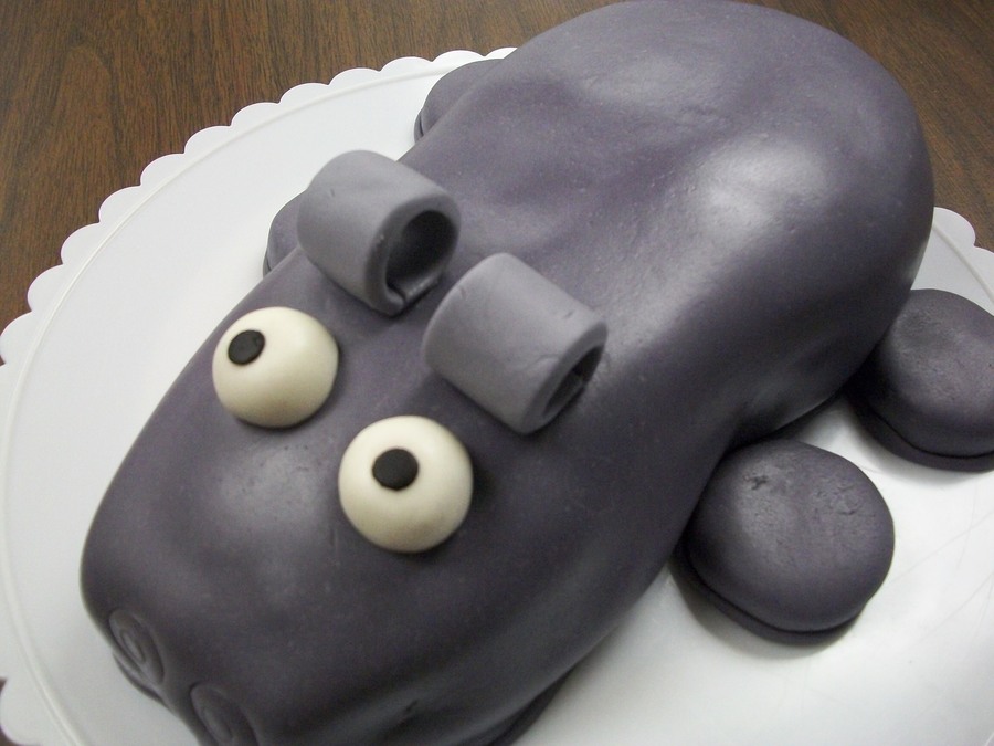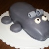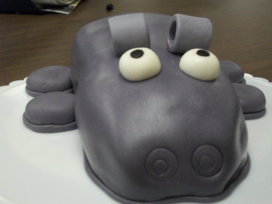 This is a Hippo cake I made for my friend Sally. Chocolate cake with butter cream frosting, covered in fondant. I should have used Oreo cookies for the legs, they would have been easier to frost and cover.