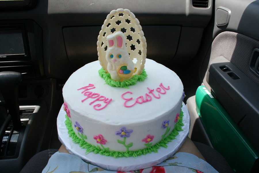Chocolate cake with buttercream frosting. Gumpaste egg, and white chocolate easter bunny (not homemade).