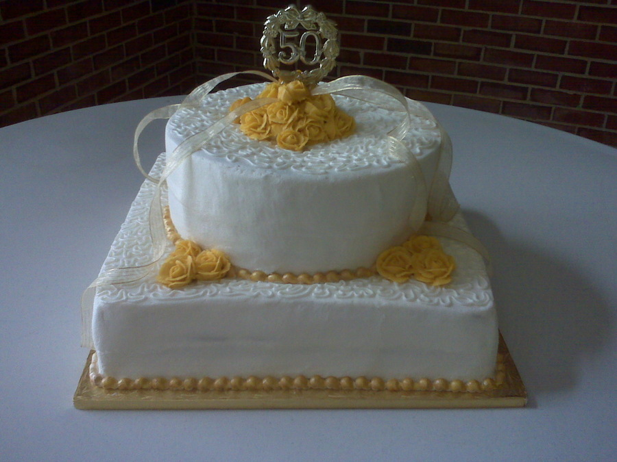 Vanilla cake with buttercream filling and icing. Royal icing border, buttercream roses.