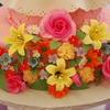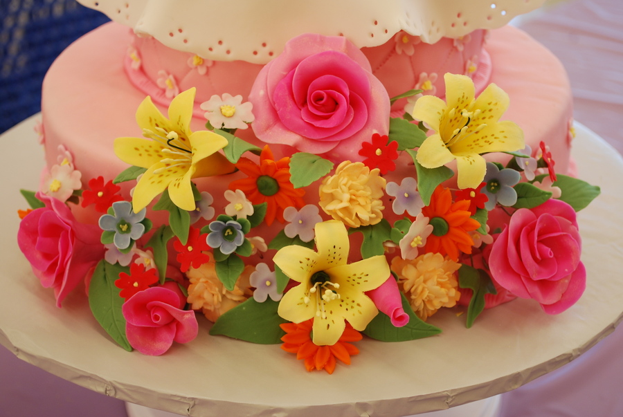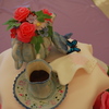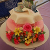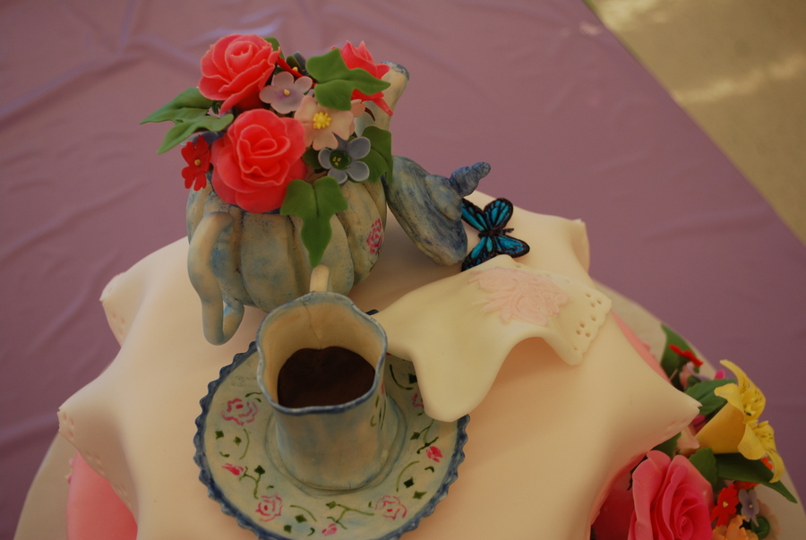 This cake was inspired from one I found on the Pink Cake Box website. I don't know who made the original cake though. The tea cup and saucer, tea pot, and butterfly made from gumpaste. The rest are made from fondant.
