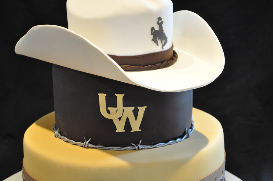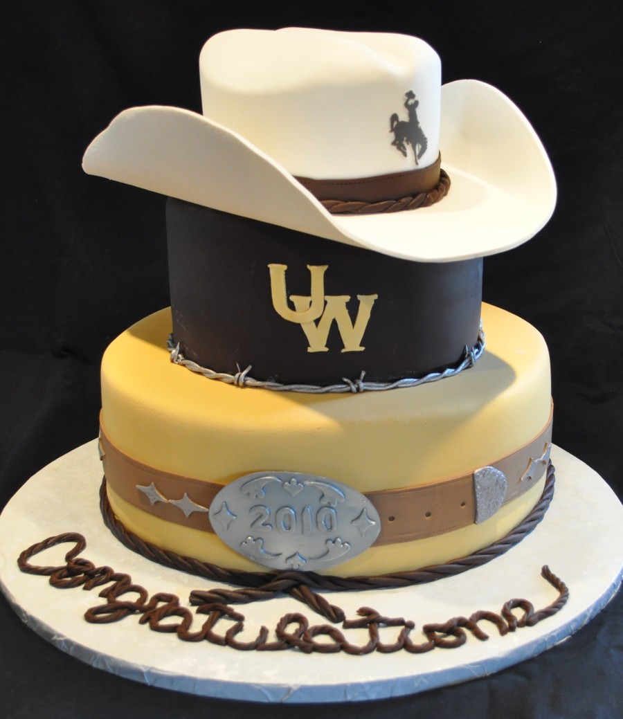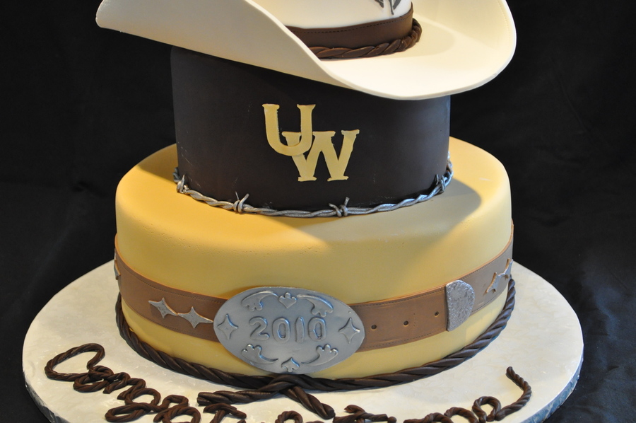 This was made for a graduate of the University of Wyoming. They are called the Wyoming Cowboys so needless to say it was done in western. Chocolate, vanilla with fondant covering.