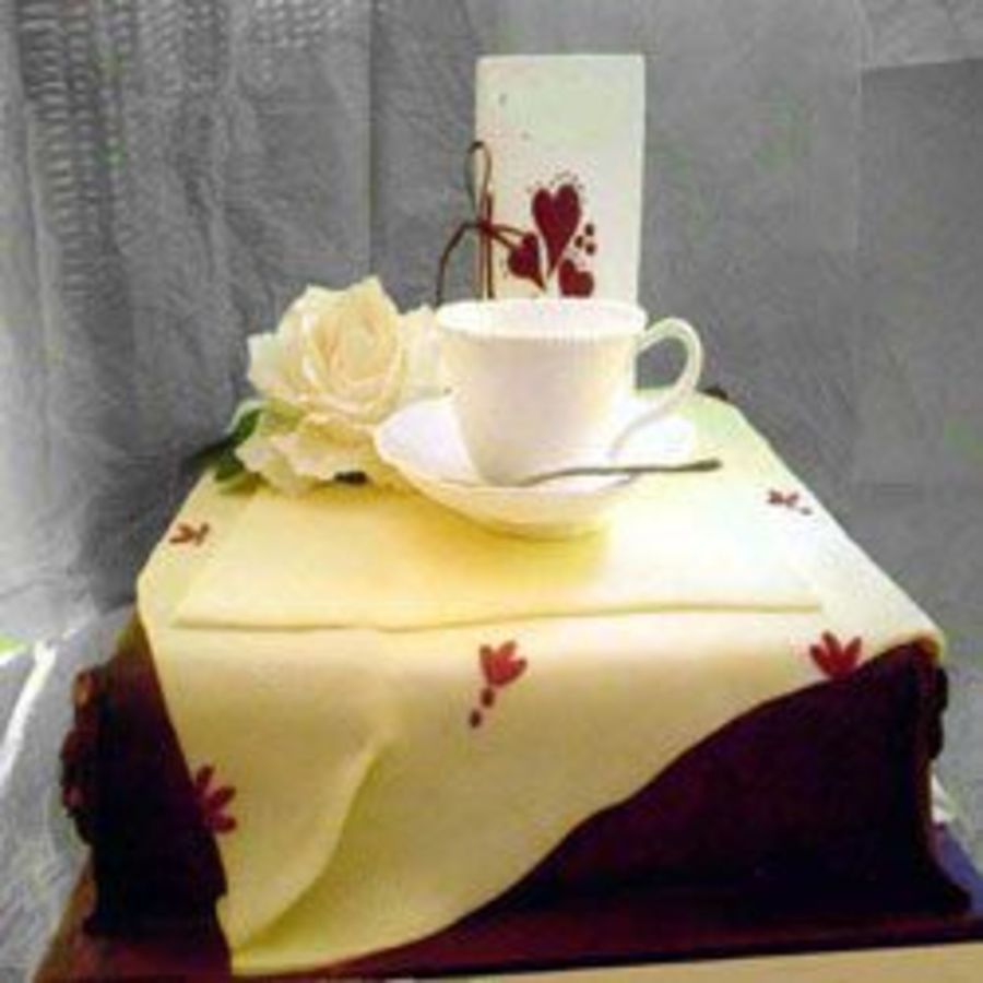 The cup and saucer, teaspoon, rose and card are made from flower paste, which I use for items that I want to harden and keep their shape. I molded the cup and saucer from one I have here at home, left to dry in situ for 24 hours then removed to finish the drying process, filing down any rough edges. Then made a handle, which I attatched with a dab of royal icing. I made the spoon in the same way, using a real spoon and laying a thin piece of flower paste over the spoon, cutting round it and left to dr