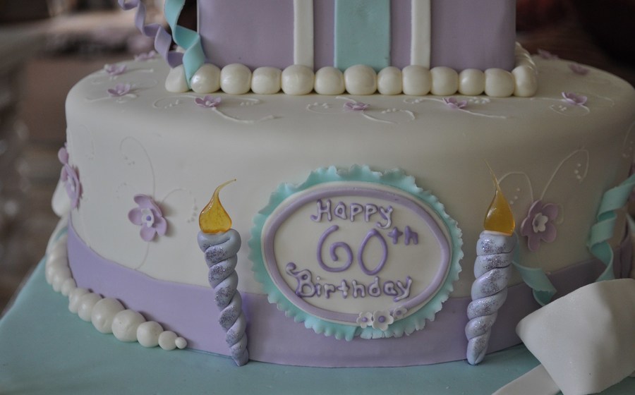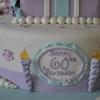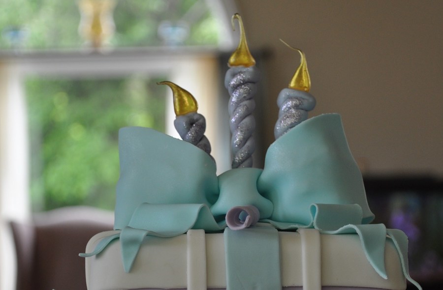 This was my first cake covered with choco-pan. Bows and flowers were made from gum paste, and the candle flames were done with poured sugar.