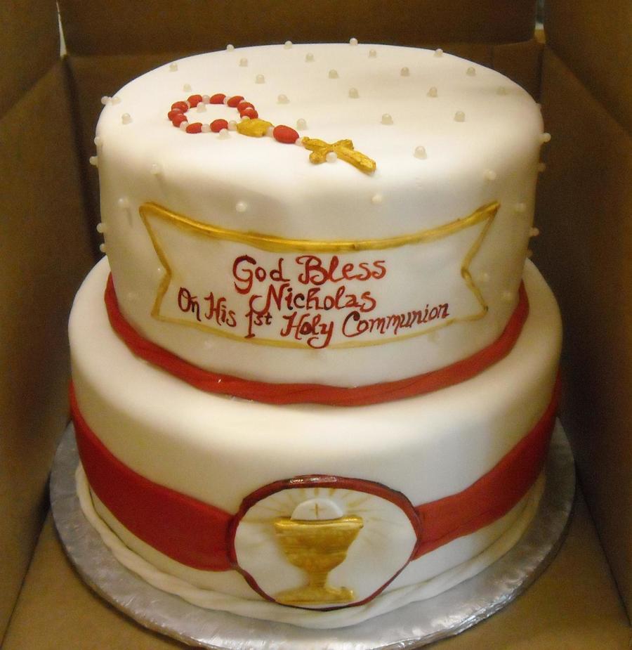 For a little boy making 1st Communion, who doesn't like blue. Just red. Kids are so funny. All fondant, including mini rosary. TFL