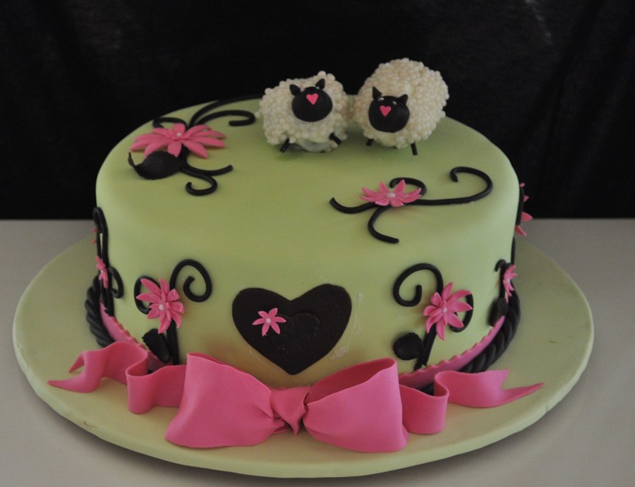 This was a custom cake done for a bridal shower. Her colors were hot pink, lime green, and black. The mother of the bride wanted sheep on the cake, as the bride collects them. Everything done in fondant, except for the sheep which were done like cake pops.