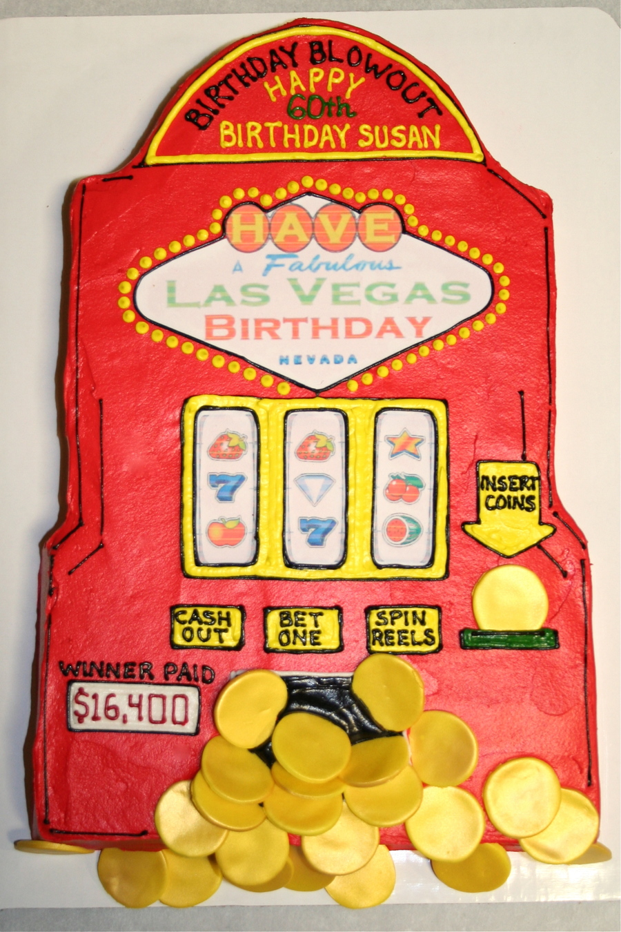 all buttercream with edible image Las Vegas logo and fondant coins