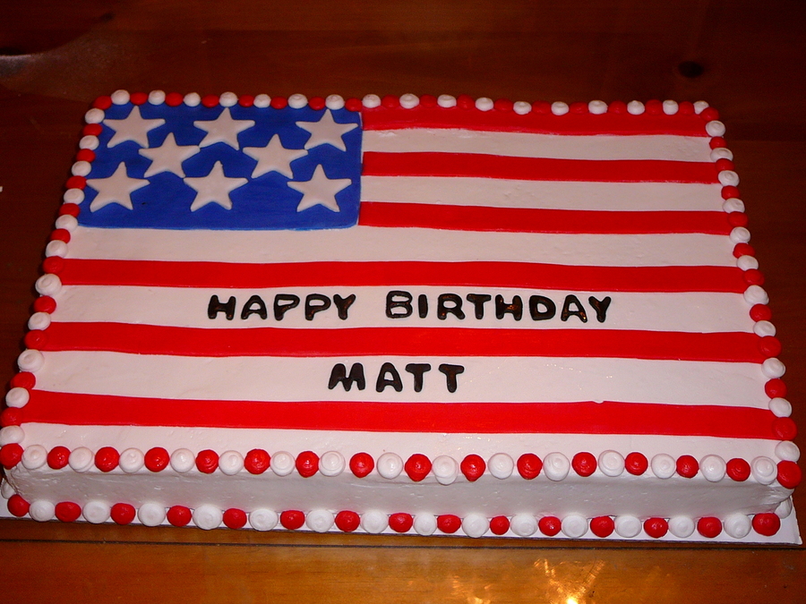 This was done for a birthday and welcome to the US cake. Buttercream base icing with fondant start, stripes and blue background