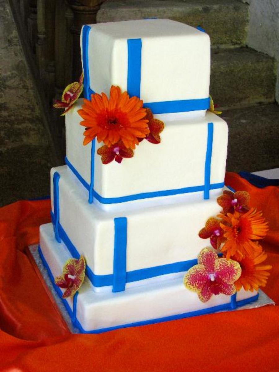 4-tier square wedding cake (6", 8", 10", and 12"). Bottom tier is 2", and the other three tiers are 5". Accented with blue stripes, orange gerber daisies, and orchids.