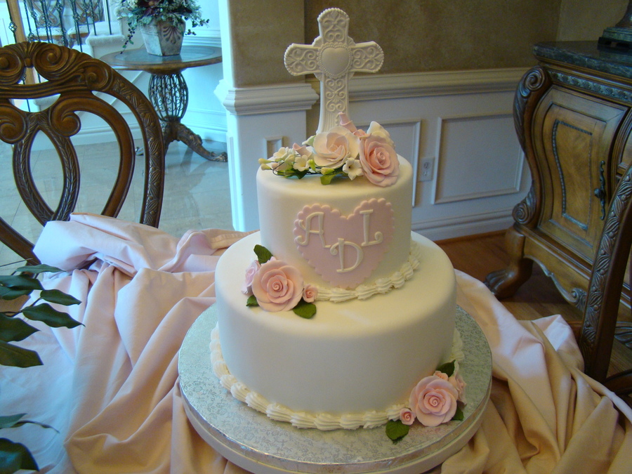 10 & 6 inch round covered in fondant. Flowers are gumpaste. Cross is a resin cake topper.