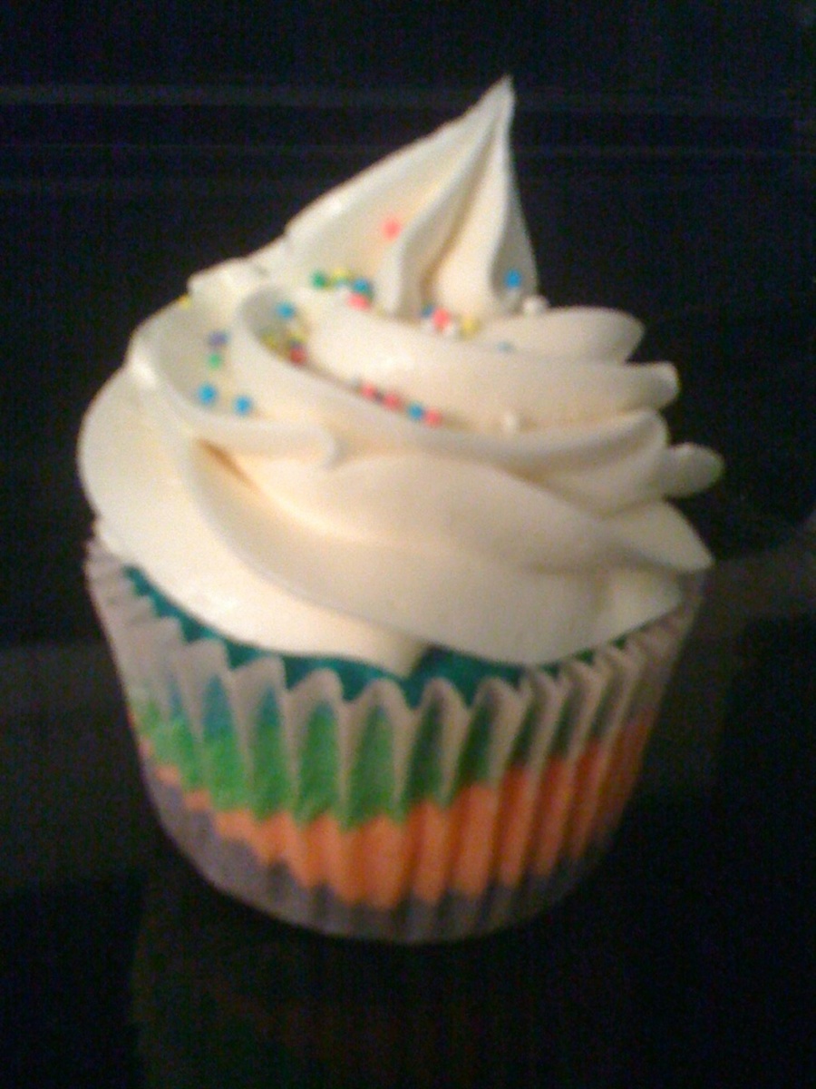 colored batter of lemon cake -- topped with cream cheese frosting and sprinkles