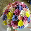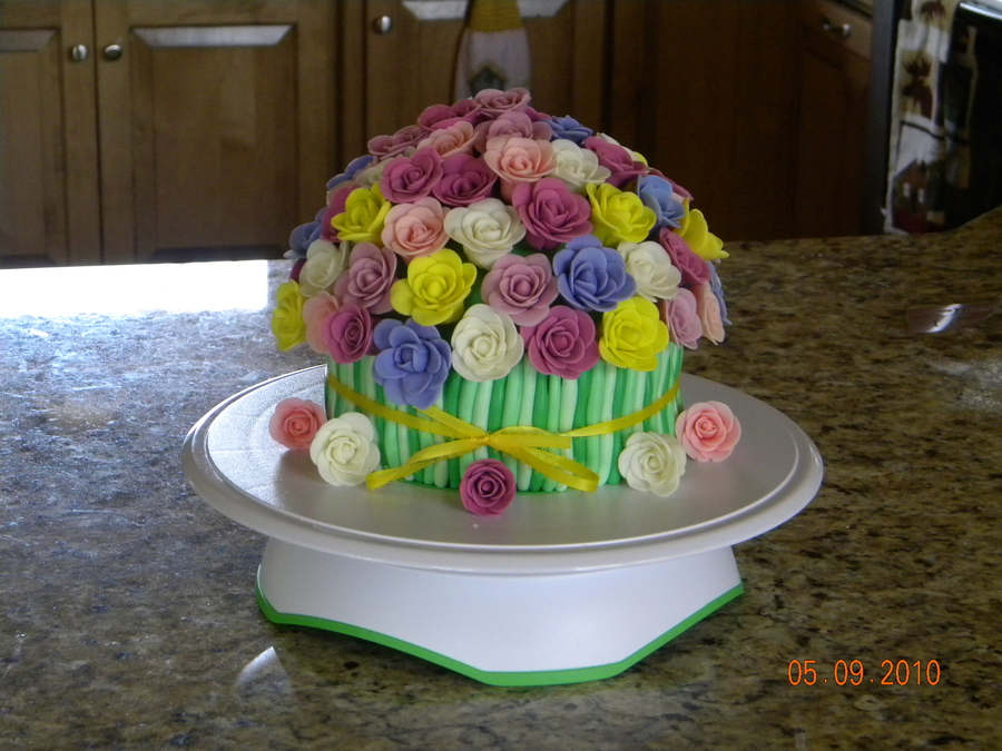 I made this cake for Mother's Day. It was my first attempt at making fondant flowers. I tried using a clay extruder for the stems, but couldn't get them to come out smoothly, so I had to roll them by hand. They aren't as uniform as I would have liked them to be, but this was the best I could do by hand. The cake is chocolate with Oreo filling. It's two 6" round cakes with a half ball cake on top. Everything, except the ribbon, is made of marshmallow fondant. Thanks for looking.