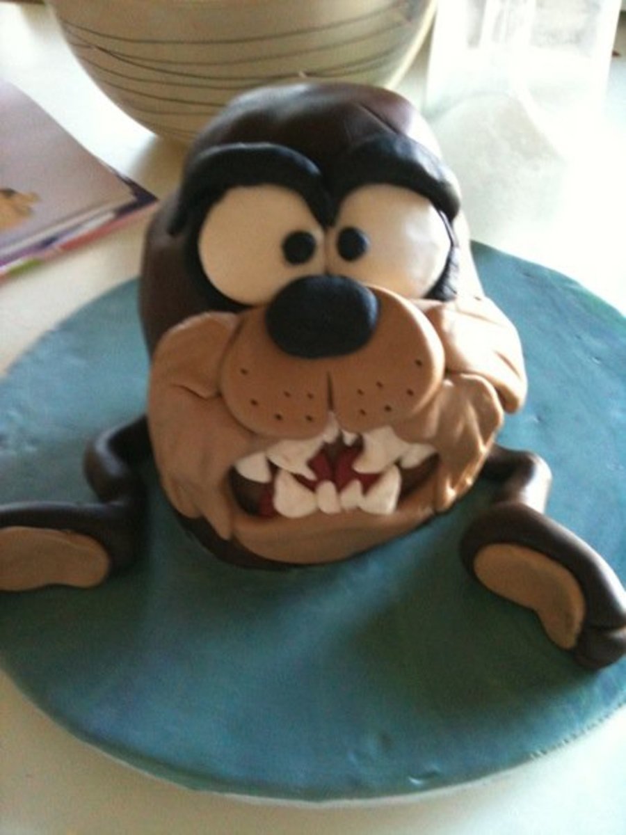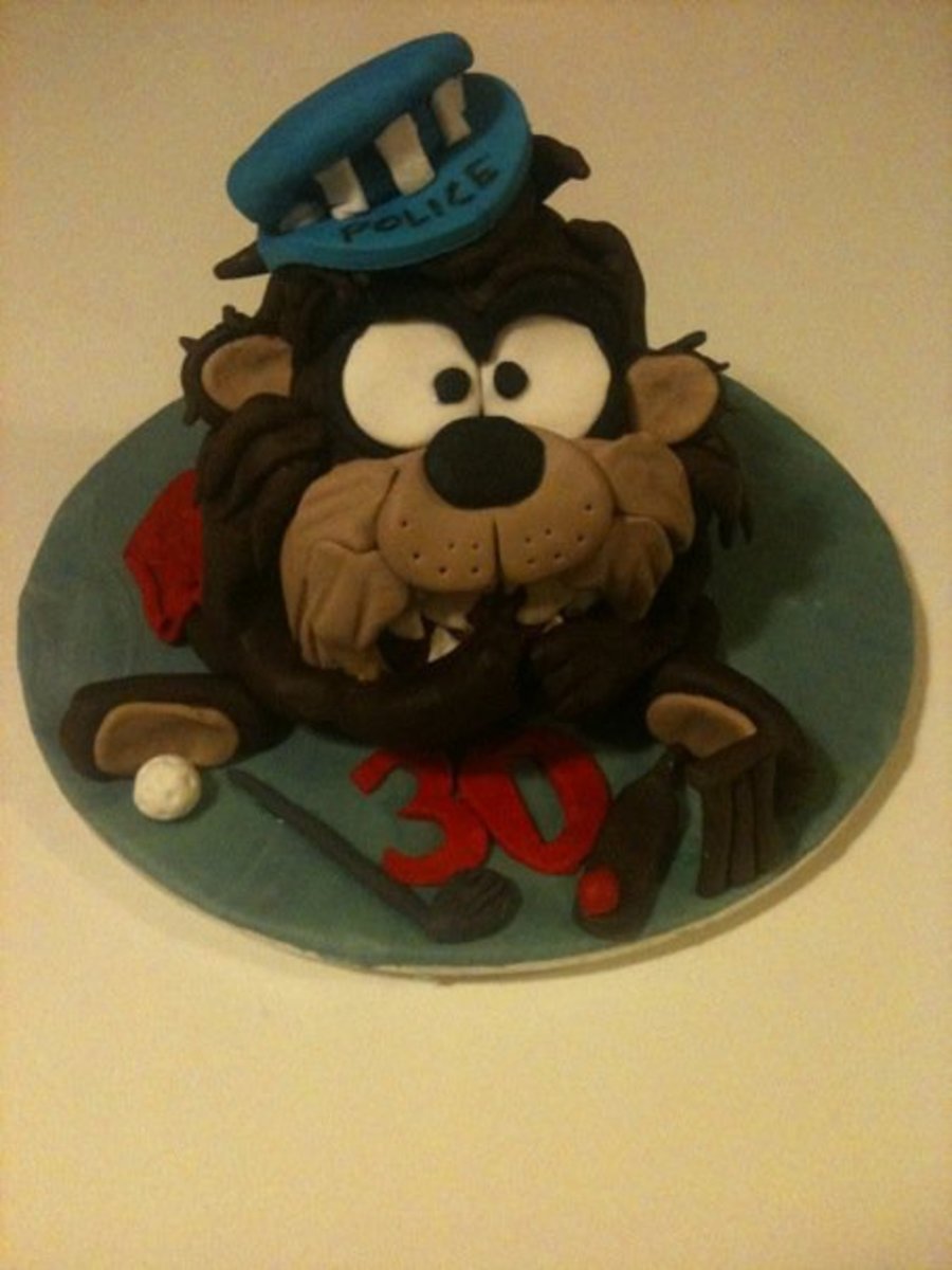This was copied from Debbie brown's book cartoon cakes. I made this for my hubby's 30th birthday. His favorite cartoon. I added a police hat, golf clubs, and cricket set as they are all little parts of him. It was a caramel mud cake with chocolate ganache... I was told it was very yummy :)