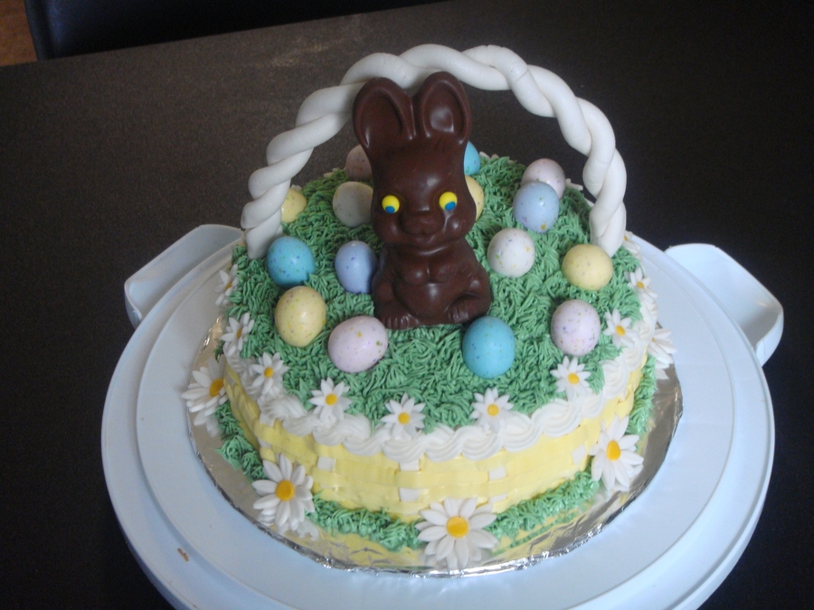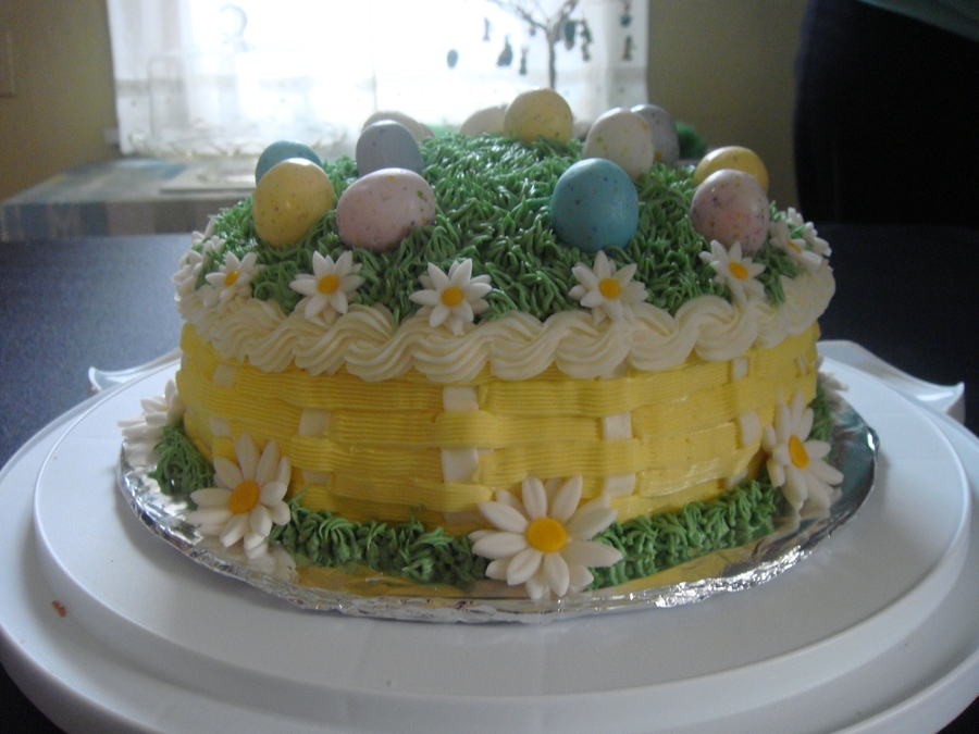 Another easter basket cake. Buttercream basketweave and grass, fondant daisies, malted milk eggs.