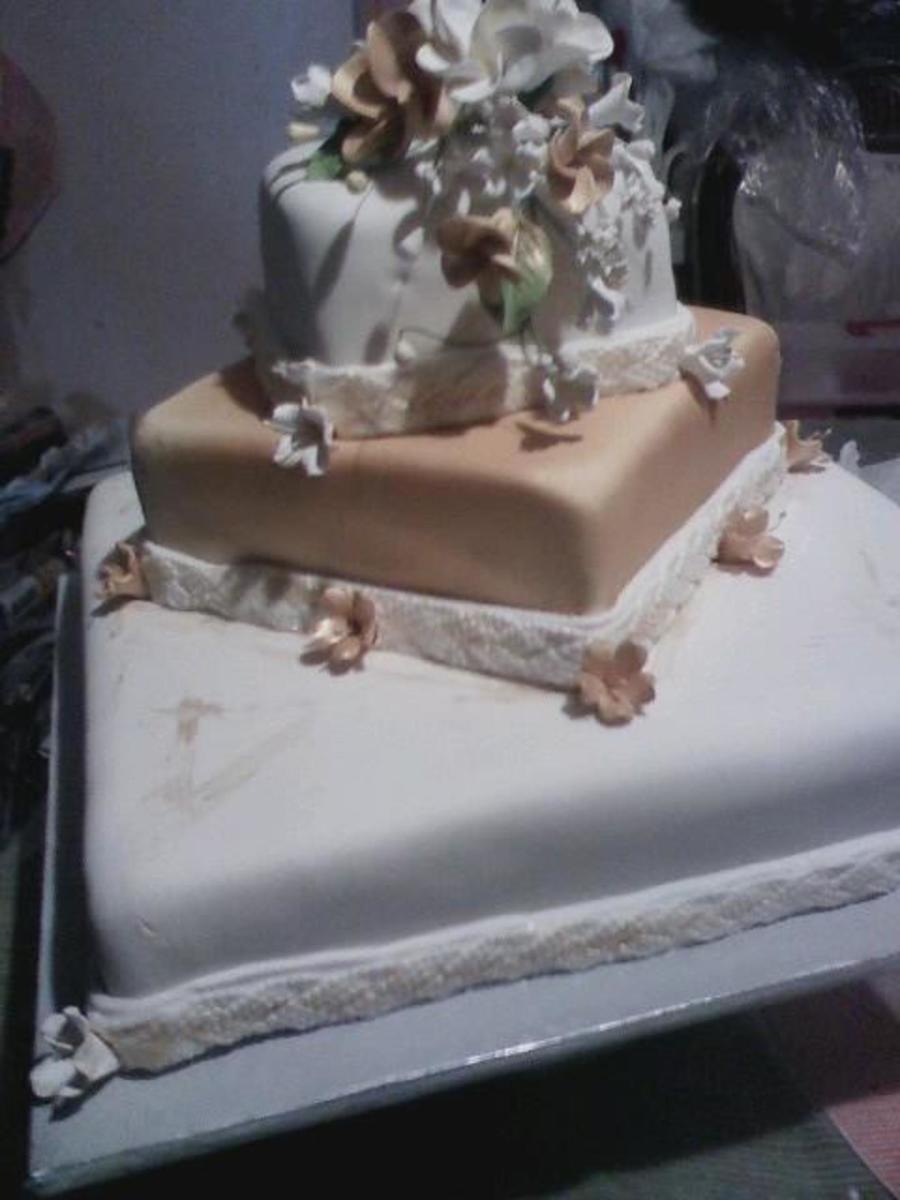 Yellow cake with buttercream and fondant. Flowers are gumpaste.