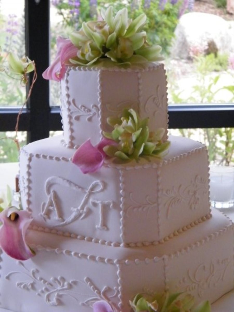 Three tiered square cake wrapped in ivory fondant with royal icing piping detail. Complimented by blush pink calla lilies and green orchids.