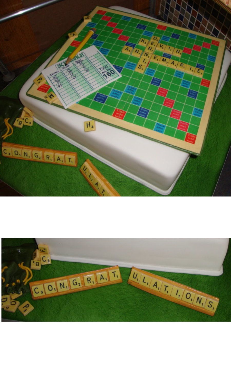 Sugarpaste scrabble board and accessories on a fondant covered chocolate cake...A birthday cake for 3 people.