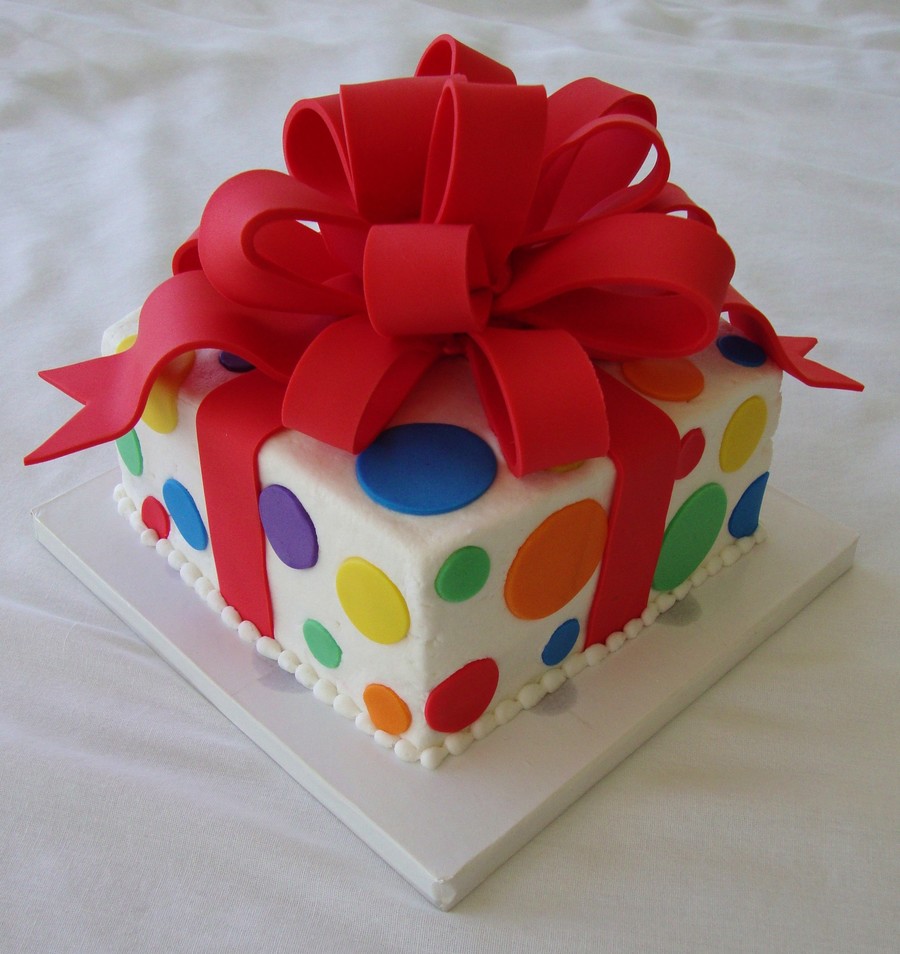This is a 6" square chocolate cake with peanut butter buttercream filling and white buttercream icing, with fondant red bow and primary color dots. So fun & festive I think.
