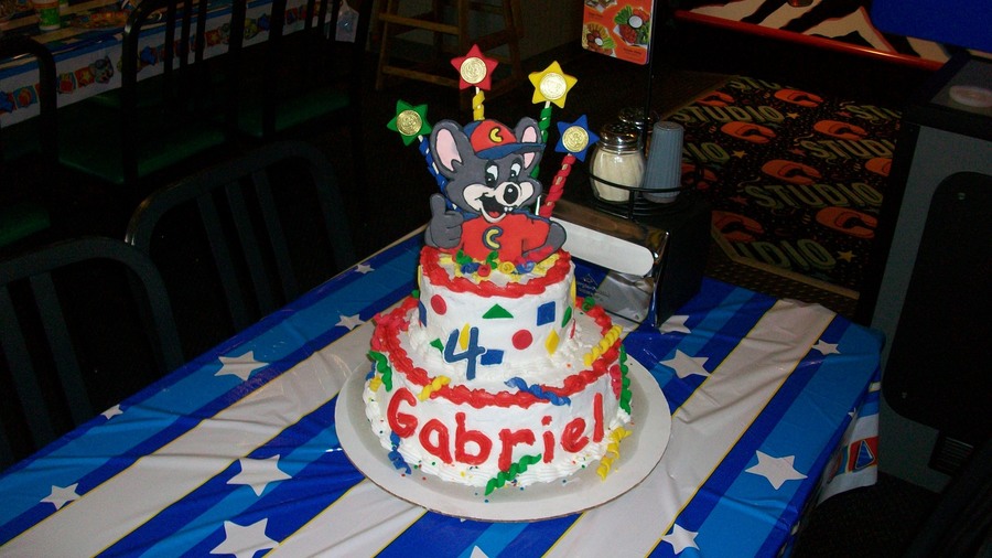 A 2 tier cake with Chuck E. Cheese popping out of the top. The mouse is made from the royal icing similar to color flow. Once the image dried I used royal icing to glue skewers to the back for extra support. There are real tokens inside the primary colored fondant stars. Streamers and basic shapes made this cake burst with fun for my 4 year old little boy.