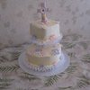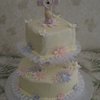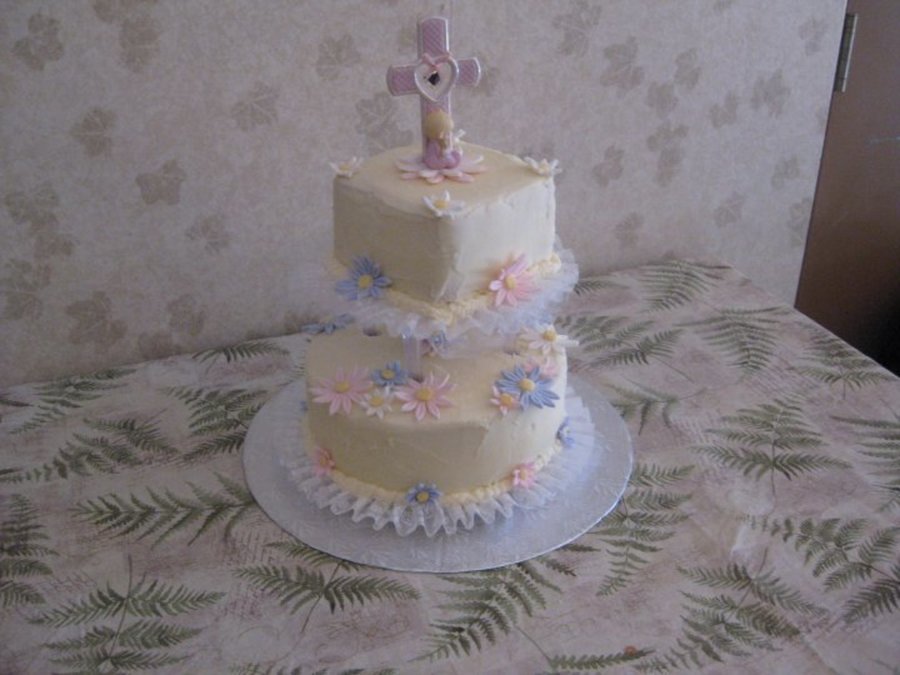 I made this for my great niece's baptism...lemon cake with raspberry and cream filling... buttercream frosting with mmf daisies