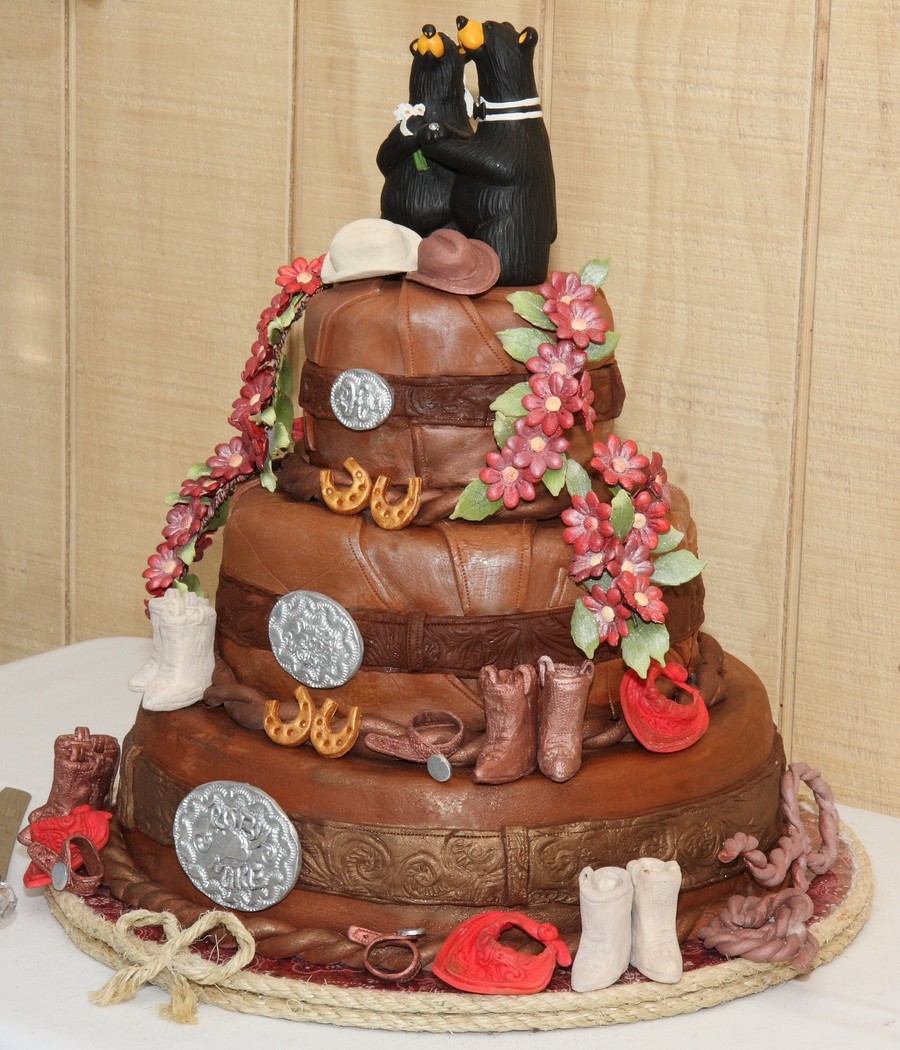This western wedding was just the ticket with a real leather look, stitching and leather 'belts' on each tier. Each belt buckle had something different on it, like the wedding date, couple's monogram and their names. In order to make the tooled leather look of the belts, I bought some molding medium at the craft store and made a pattern from an old tooled-leather purse my sister had.