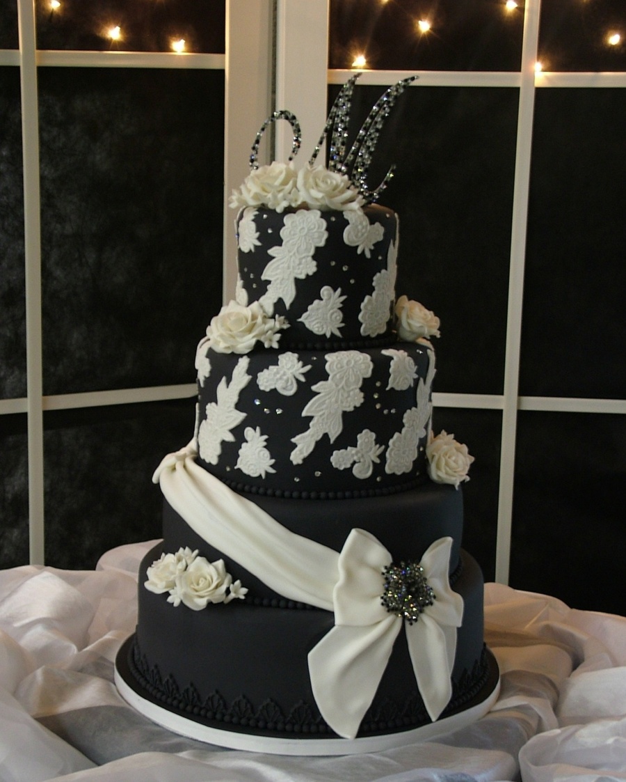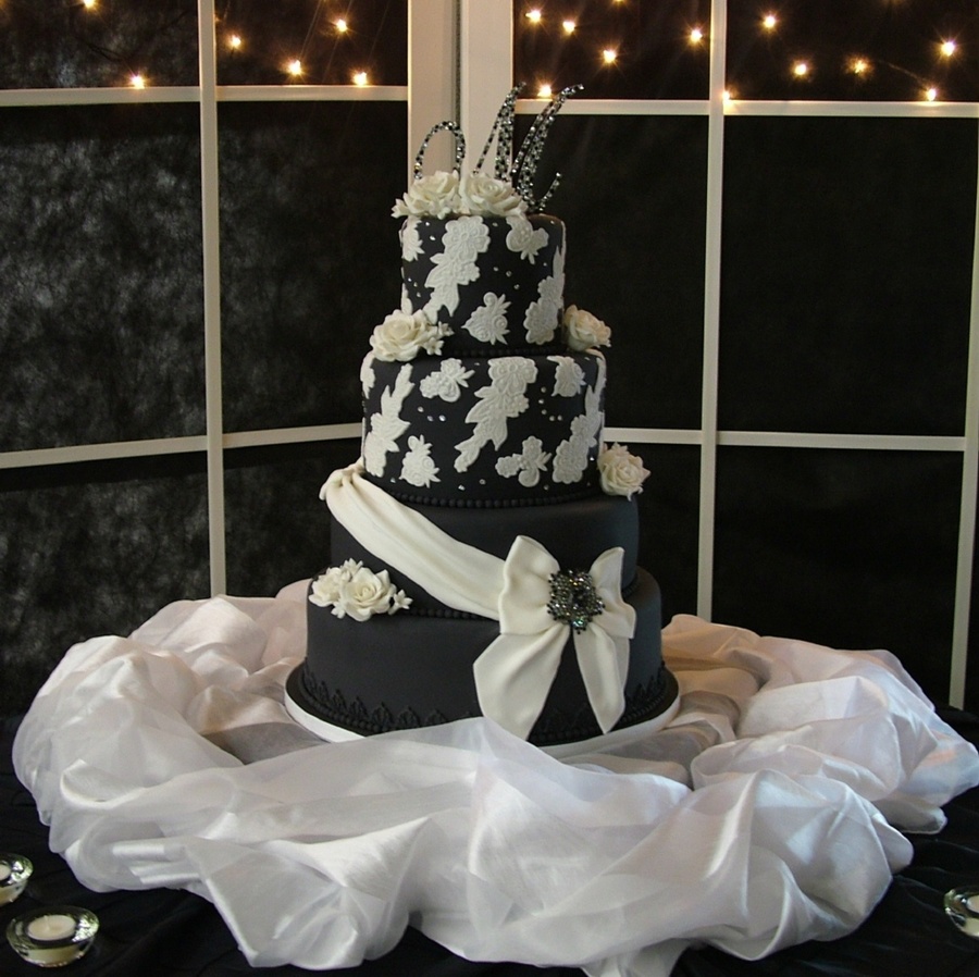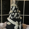 This is my first Black and White wedding cake. I love how it turned out . Gumpaste flowers. swarovski crystals. Monogram was ordered by Bride. Broach supplied by me.