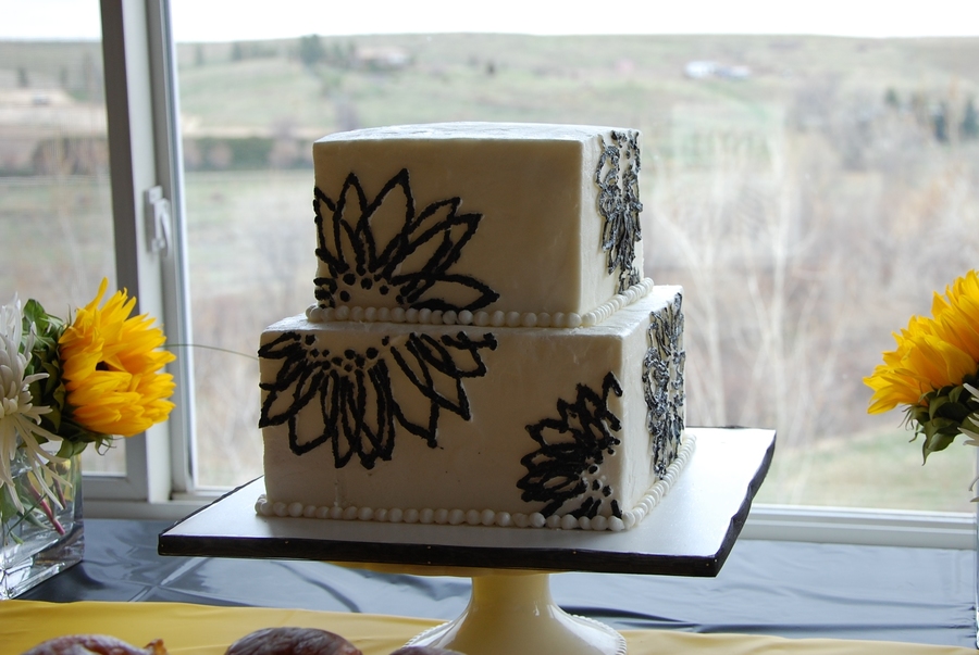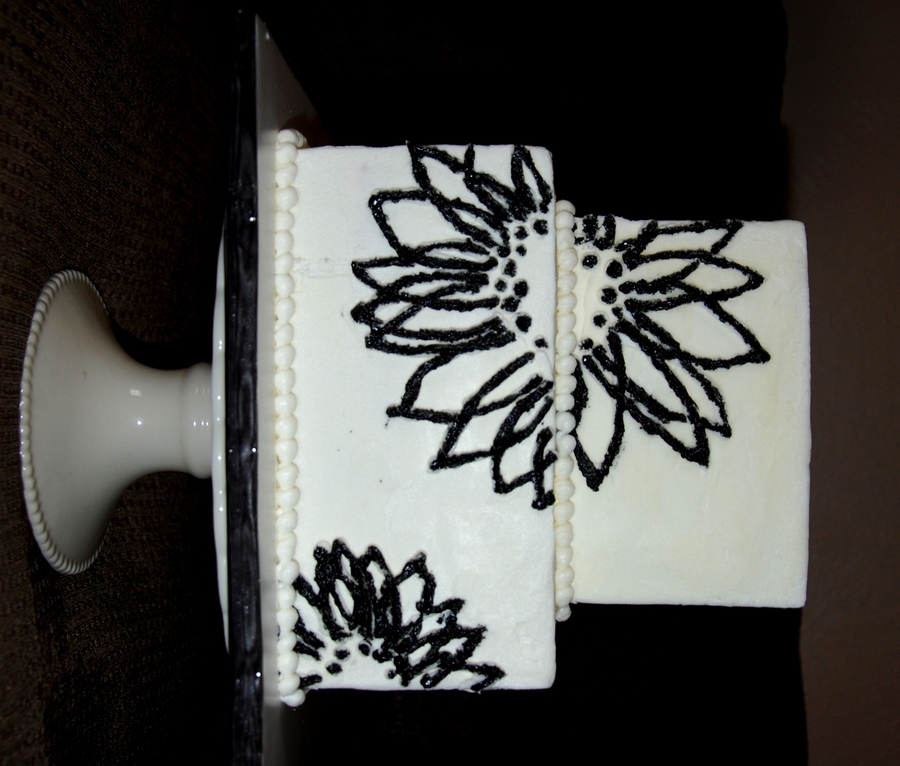 The sunflower is hand piped onto the cake to match the invitations. I piped white frosting on, then brushed the black coloring on top so that it matched the roughness of the actual logo. My inspiration originated from the Andy Warhol cakes that are floating around, but then simplified to match the logo and color of the wedding. 9" and 6" pink champagne.