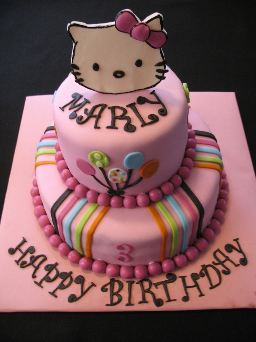 This was a hello kitty cake made to match the decorations. It was cute, the mom ordered it more for herself than her 3 year because she loved hello kitty so much (Childhood memories). Anyway, the hello kitty is made out of gum paste and the rest is fondant. Thanks for looking!!!