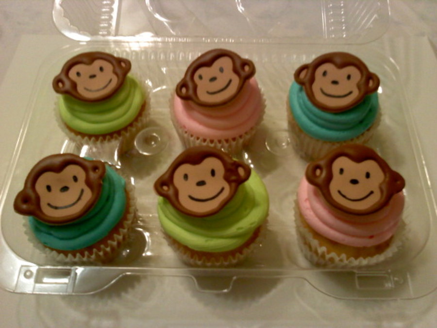 Monkey cupcakes covered in buttercream with fondant cutout faces. Drew the face on with food color marker and the brown section was done with thinned royal icing.