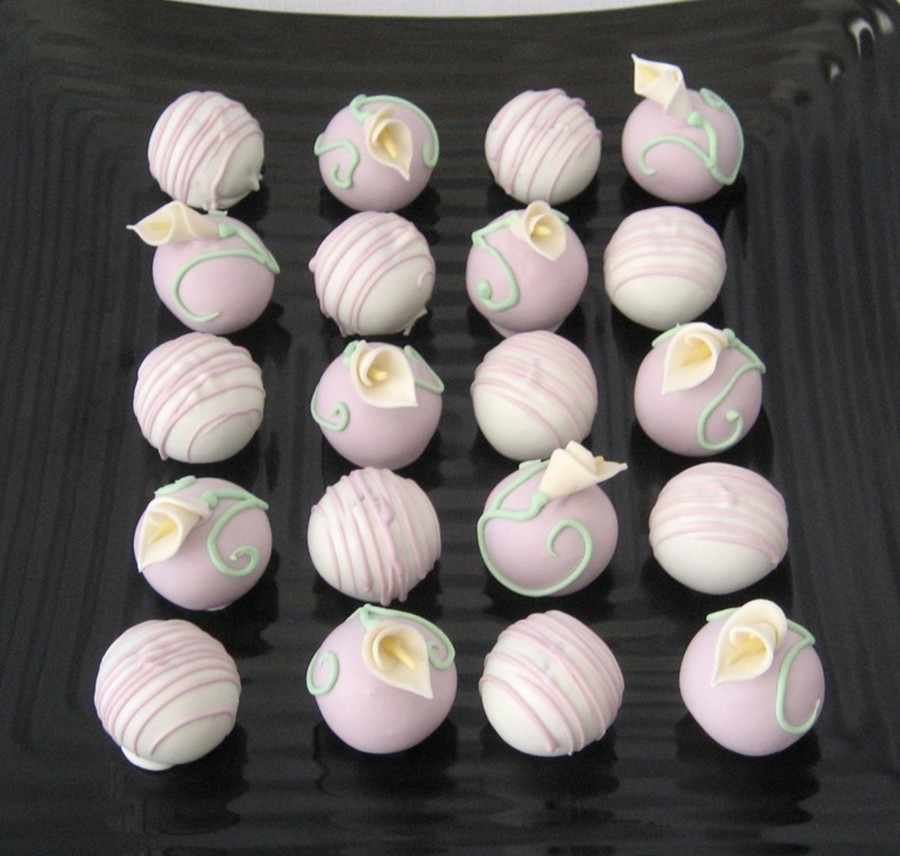 chocolate hazelnut cake balls dipped in tinted white chocolate. Fondant callas.