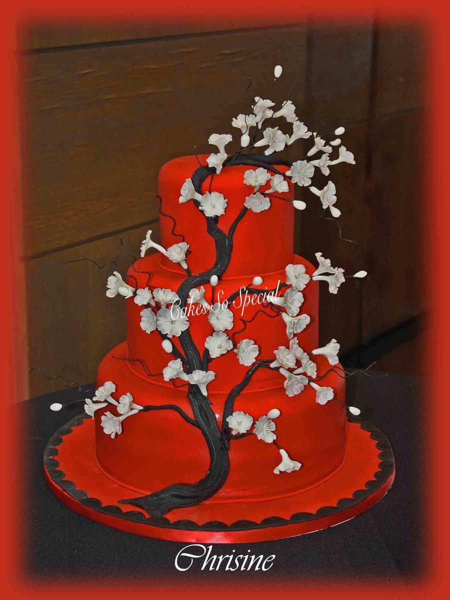 6, 9, and 12" cakes covered in red fondant. Black tree with white wired cherry blossoms. TFL