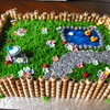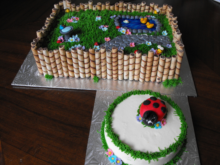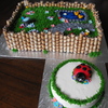 Buttercream grass, fondant decorations, piping gel pond, cookie fence. I have a lot of fun making this for a special 1 year old!