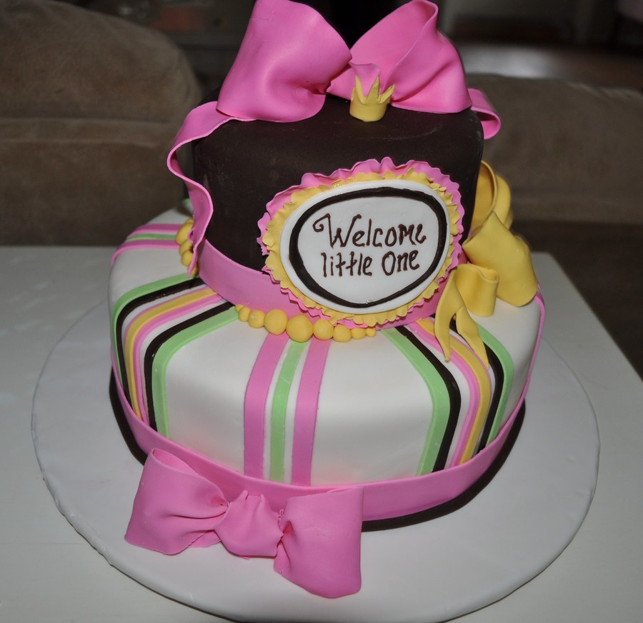 Covered in white choco-pan and dark chocolate fondant. Gum paste plaque and bows.