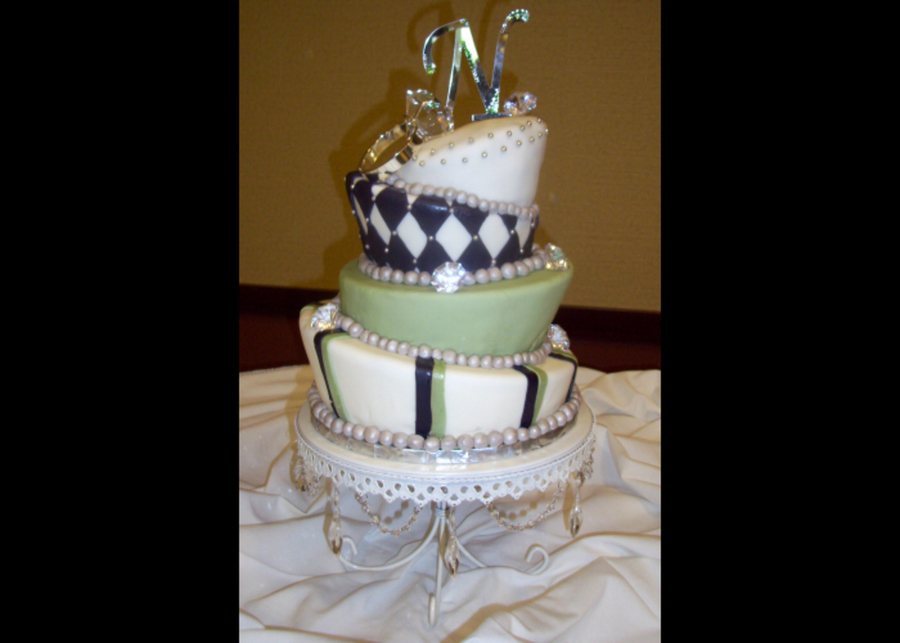 I love this cake. The bottom 3 tiers are dummy and the top tier is chocolate with raspberry filling. The bride supplied me with the diamond ring and diamonds to place around the cake.