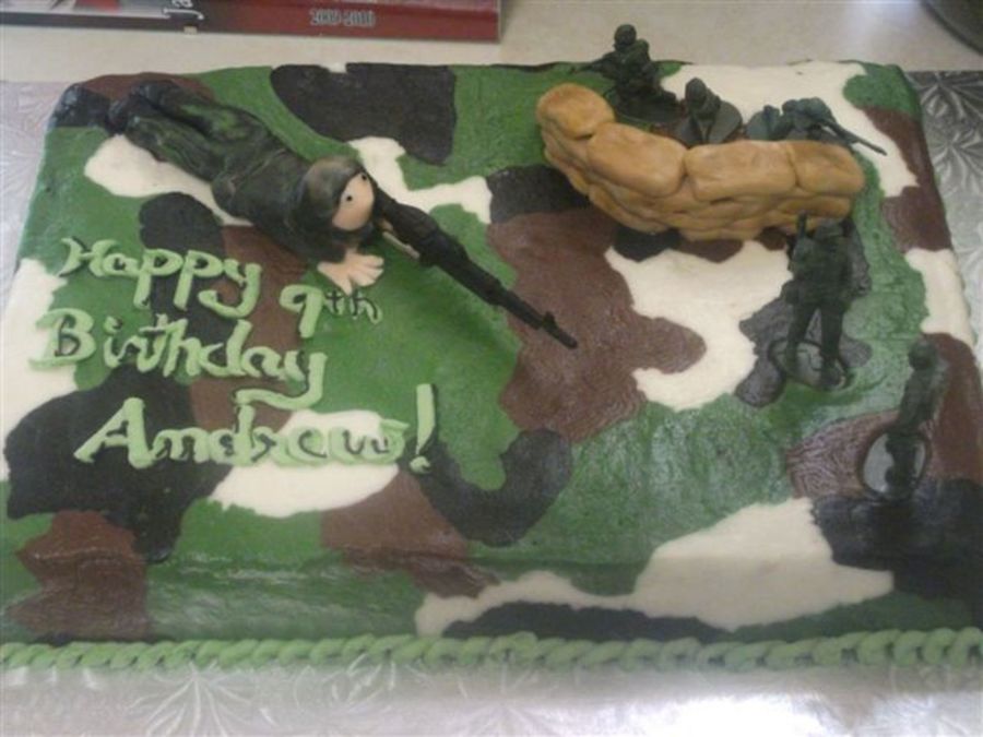 This cake was for Andrew he is really into the army and his mom wanted a camouflage background. I did it in buttercream icing. Handmade the sniper and the sandbags with modelling chocolate.