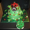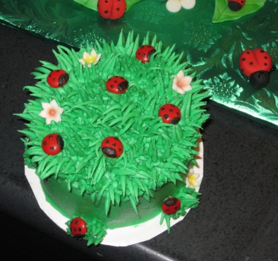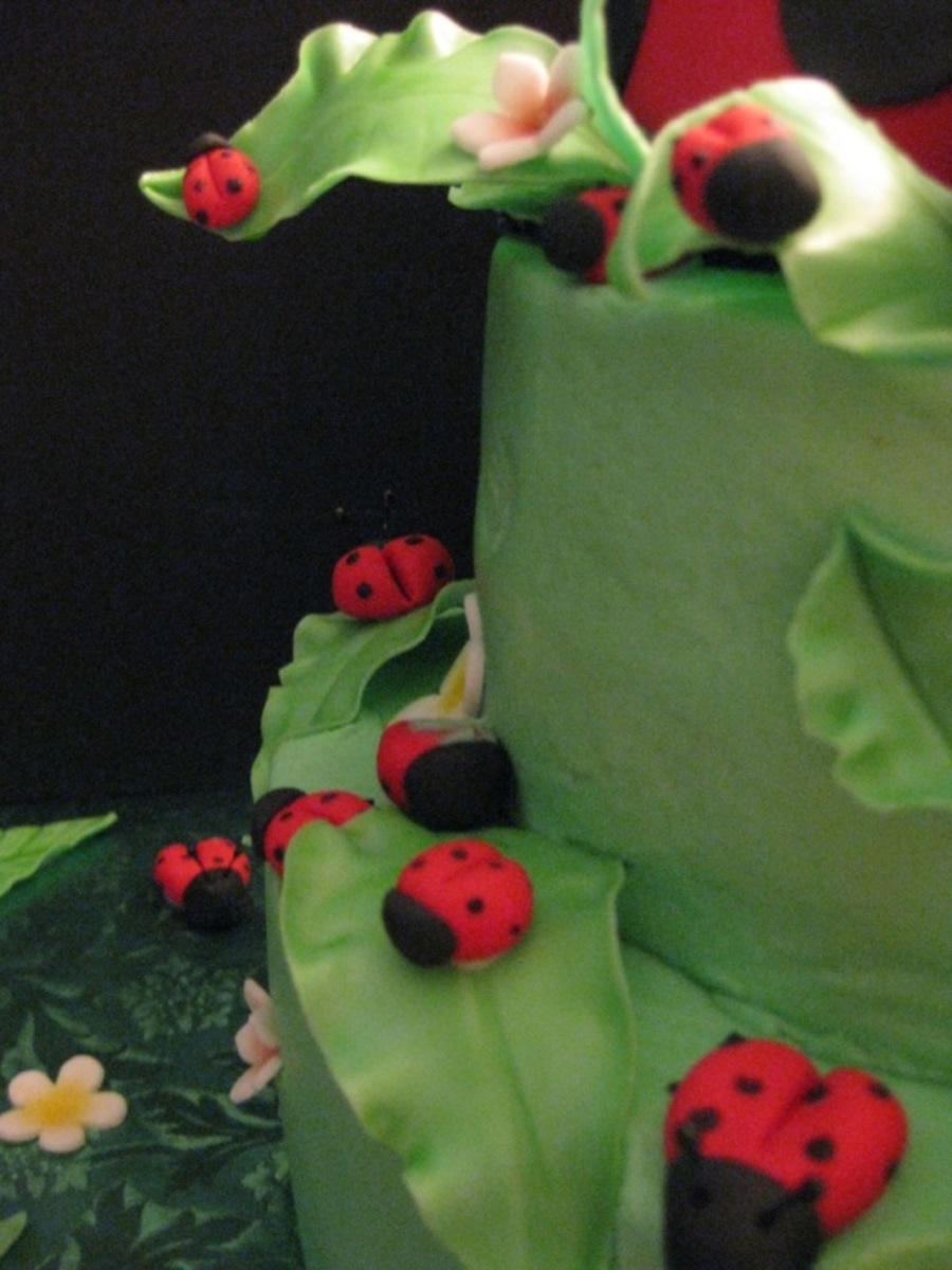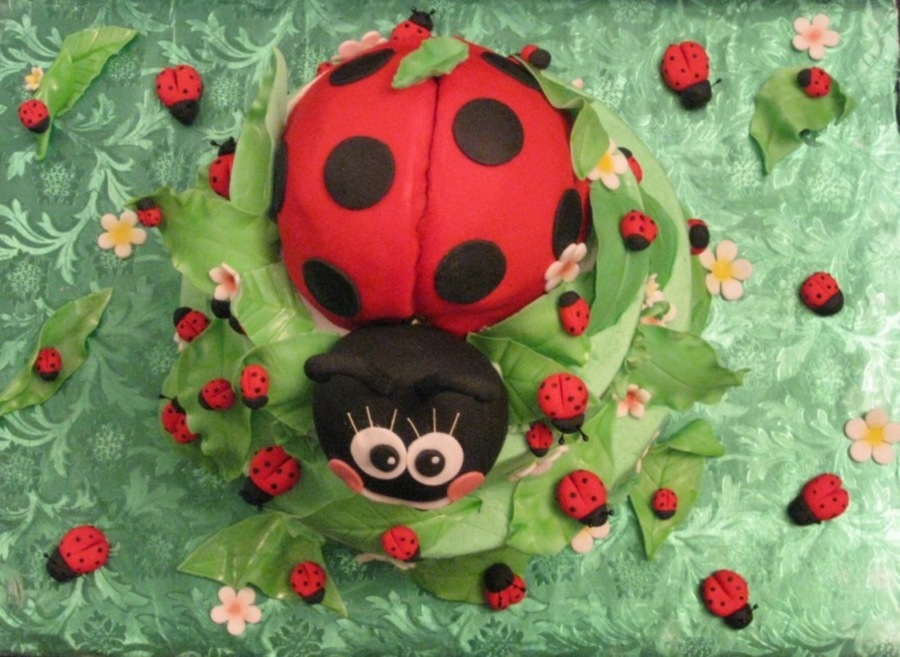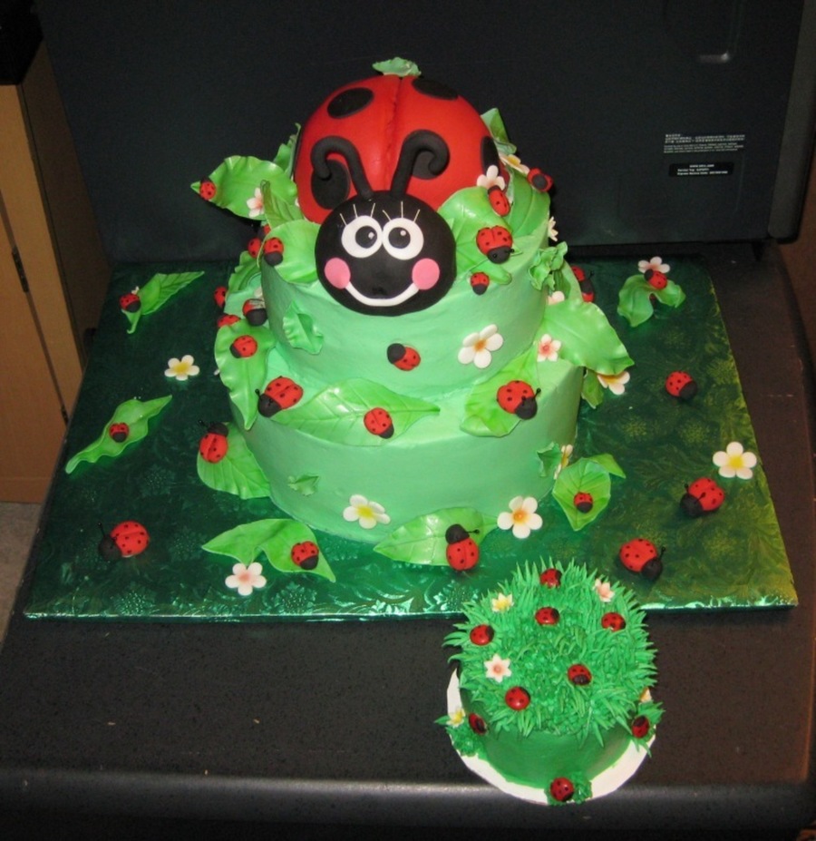 I want to thank fantasticakes for the ideas... Your work is awesome!! I made 55 little ladybugs. The smash cake has mnm's with chocolate for the ladybugs. The large ladybug on top is also cake. I had so much fun making this cake. This cake went with the ladybug cookies and cupcakes too. TFL