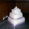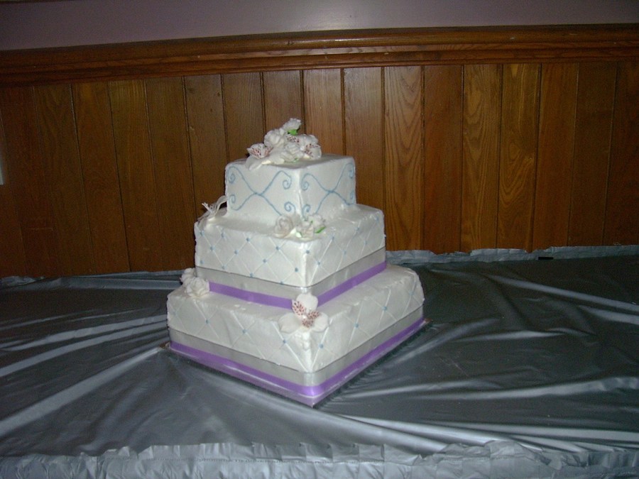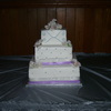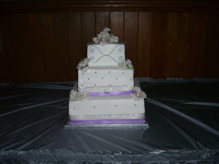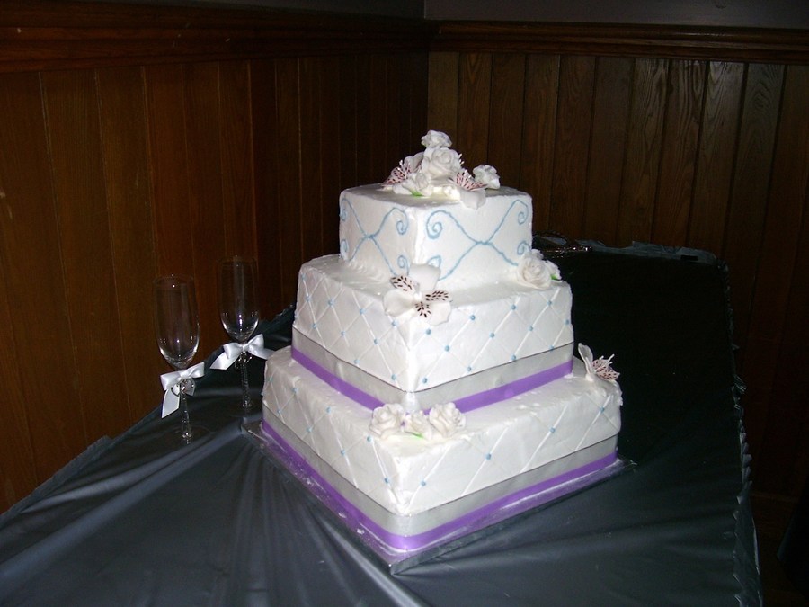 This was designed by a bride and I tried to let her know that the top tier would look out of place, but oh well...she loved it. It is a three tier stacked with butter cream. The flowers were all white (gumpaste roses, carnations and peruvian lillies) and there was purple and silver mesh ribbon. Oh and the scrollwork was powder blue.
