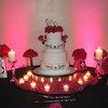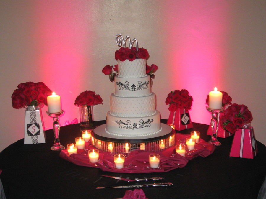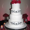 6" 8" 10" 12" Rounds iced in fondant. 6" & 10" tiers quilted and with sugar pearls at the intersections. 8" & 12" tiers have a scroll design stenciled on using black royal icing.