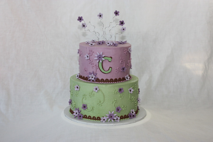 6" 8" Rounds iced in buttercream with fondant flowers and wire curly-q's on top.
