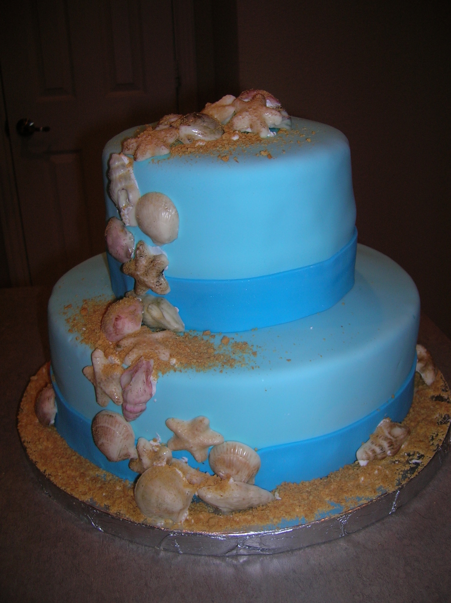 Bridal shower cake for destination wedding. Shells are chocolate candy molds hand painted. Sand is graham crackers