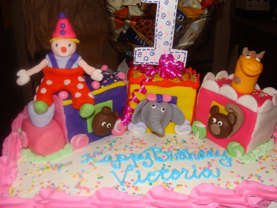 Circus Train Cake I made for a clients who's child loves clowns. I learned how to make this cake from Debbie Brown...she is awesome. Train is RKT covered in fondant and i made all the characters from gumpaste/fondant.