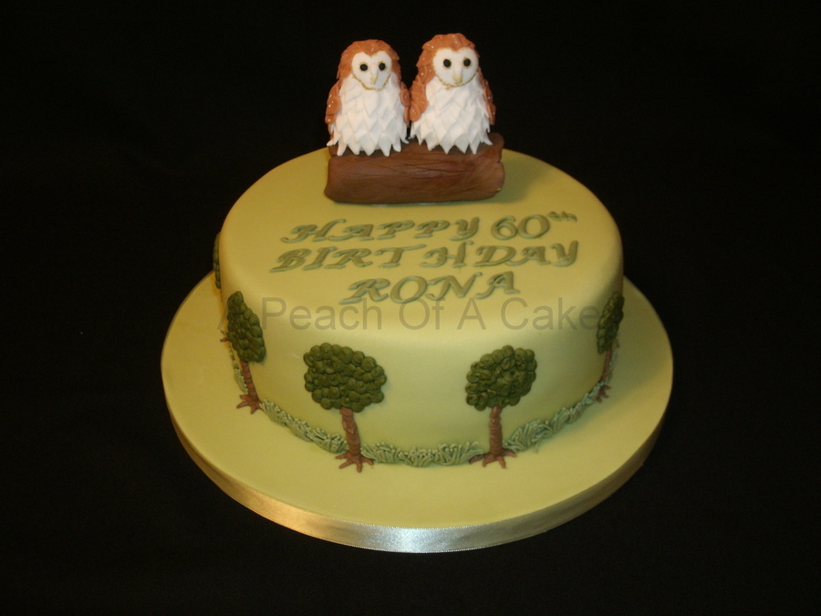 I wasn't sure how to do this cake but got advise form another forum. The owls are moedlling paste and each feather was put on individually. The trees around the side are royal icing.
