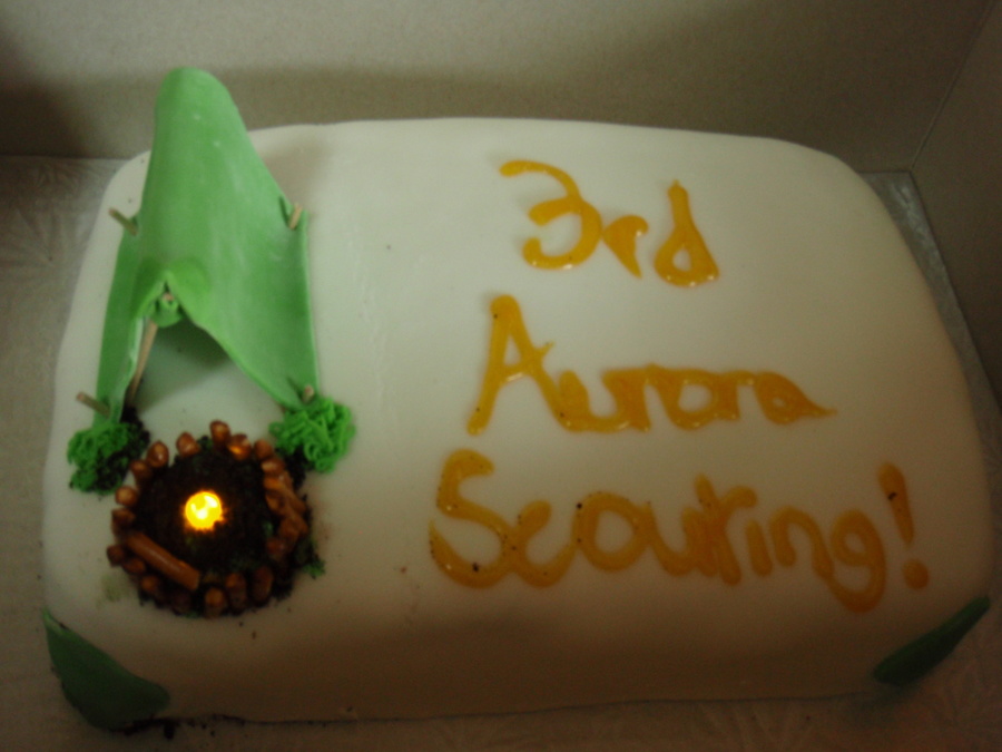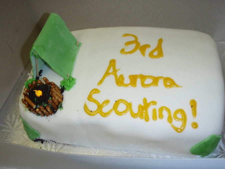 A cake I made for my scout group. Its a golden cake with buttercream icing and it was my first time covering a cake in fondant. I made the tent out of fondant too and the camp fire is an electric tea light candle covered in Oreo crumbs and surrounded by pretzles.
