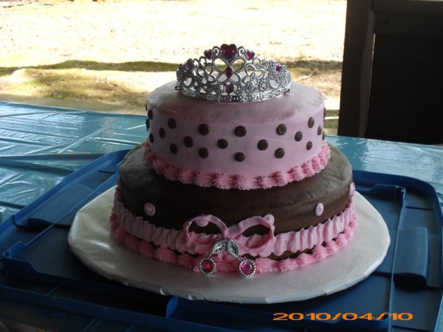 vanilla and strawberry cake, with chocolate and buttercream icing. brown and pink polka dots, fit for the princesses 1st birthday!