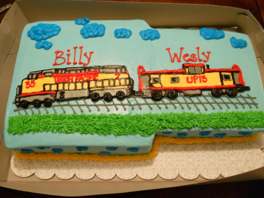This cake was made especially for a dad & son birthday combination. The big cake was made for the dad (white cake), and the small cake was mad for the son (chocolate cake). All decorations are in tinted vanilla buttercream.