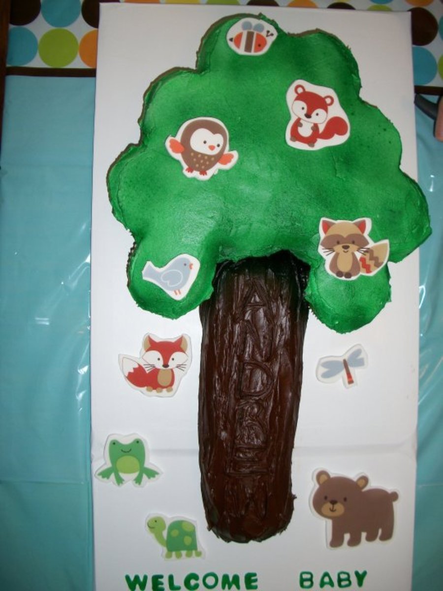 This was made to match the Carter's Tree Top theme from Babies "R Us for my sister in law. I purchased the wall decals for her as a gift and cut them out and scanned them in and printed them on edible paper. I put the images on a piece of fondant and used jumbo cupcakes to make the tree top. I iced the tree top and spray it green. The tree trunk is a chocolate log roll. I carved the baby's name into the truck and tried to put tree climbing animals in the tree and the ground animals on the board.